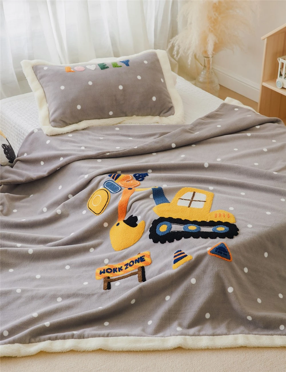 Adorable couverture et assortiment de lit pour bébé voire jeune enfant. Il saura ravir votre petit garçon avec ses machines de chantier cousues sur le drap. Vous allez créer des souvenirs!