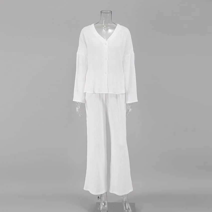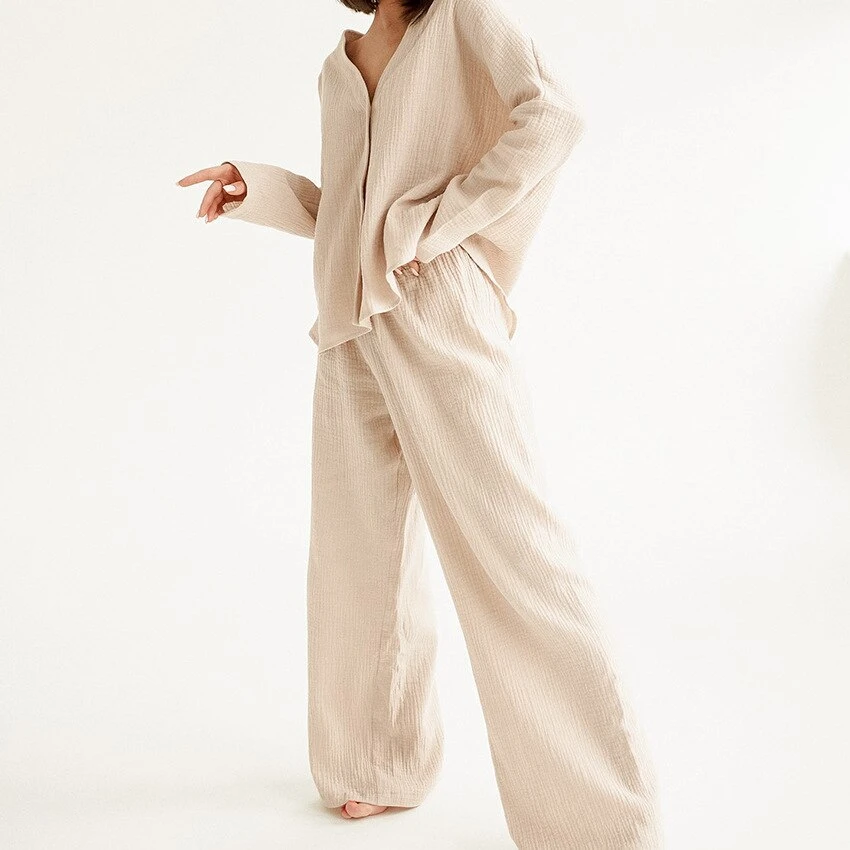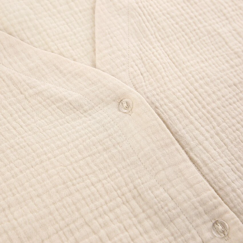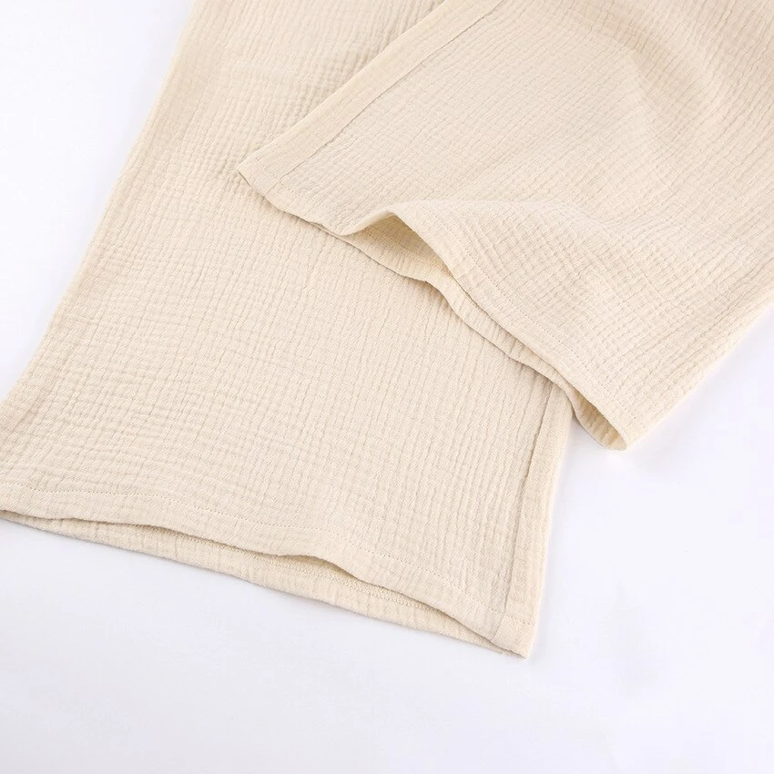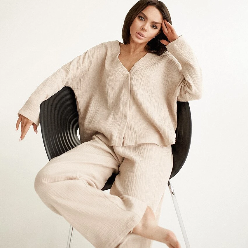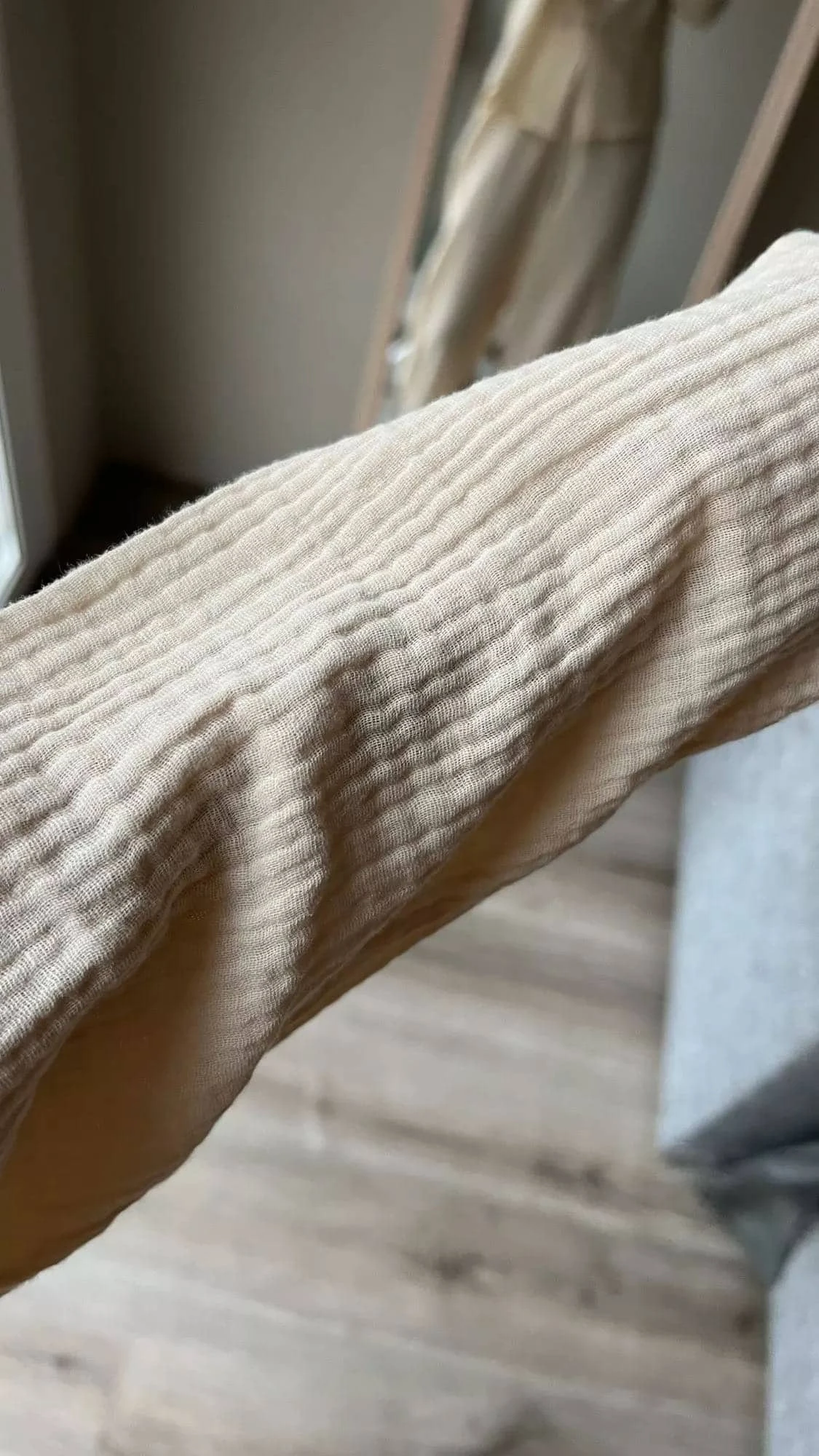 La coupe est ample et le design élégant, cet ensemble vous assure un confort maximal que ce soit pour rester cocooner sur le canapé ou à utiliser comme pyjama. Une jolie gaze de coton très agréable sur la peau