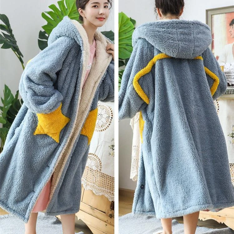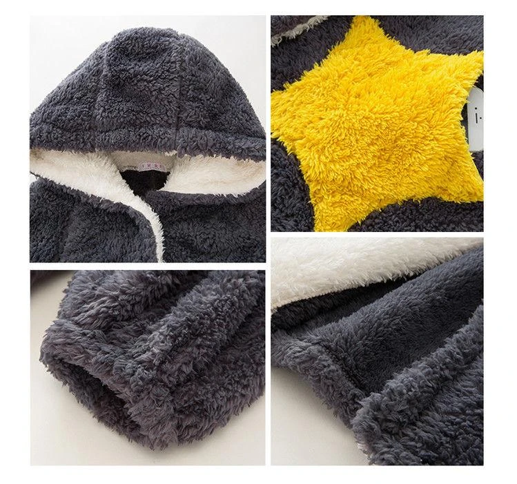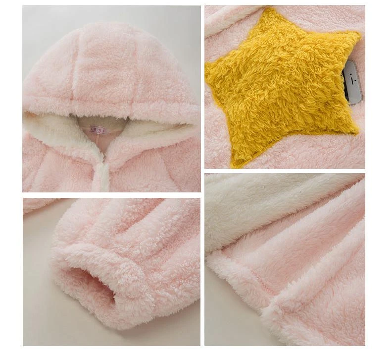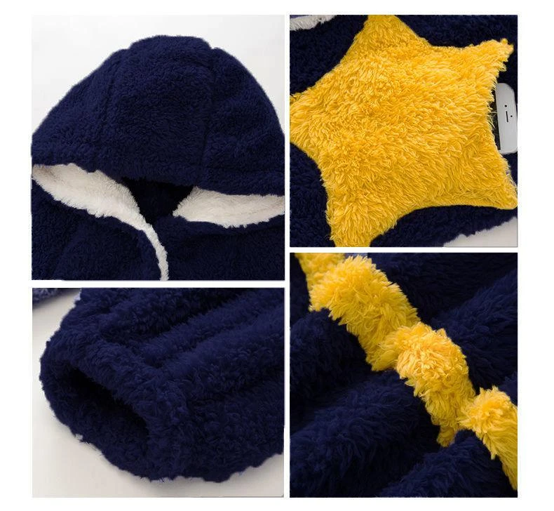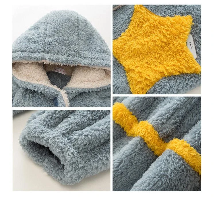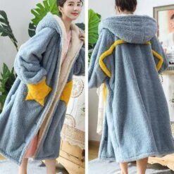 Son design assez enfantin et très amusant et vous donnera le sourire. Vous n’aurez qu’une envie, c’est de rentrer ou rester chez vous pour pouvoir vous prélasser dans ce joli peignoir tout doux et bien chaud. LEs poches sont larges, vous permettant de réchauffer vos mains. Le peignoir se ferme avec des boutons et le bas des manches est resserré pour être sur de garder la chaleur.